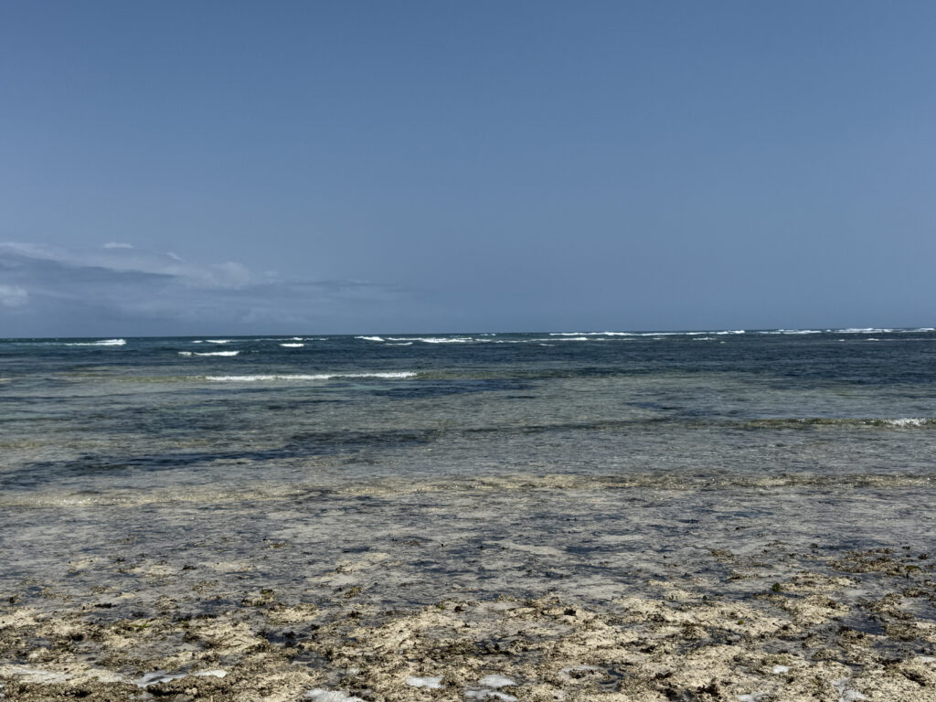 地面も砂と珊瑚の岩(珊瑚自体はもう死んでますけども)なので、足元が不確かで気をつけて歩いて行ってなんとか一番遠くの波打ち際まで辿り着きました。