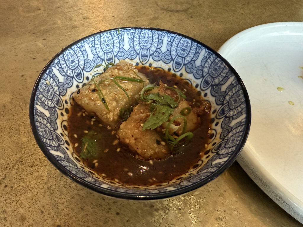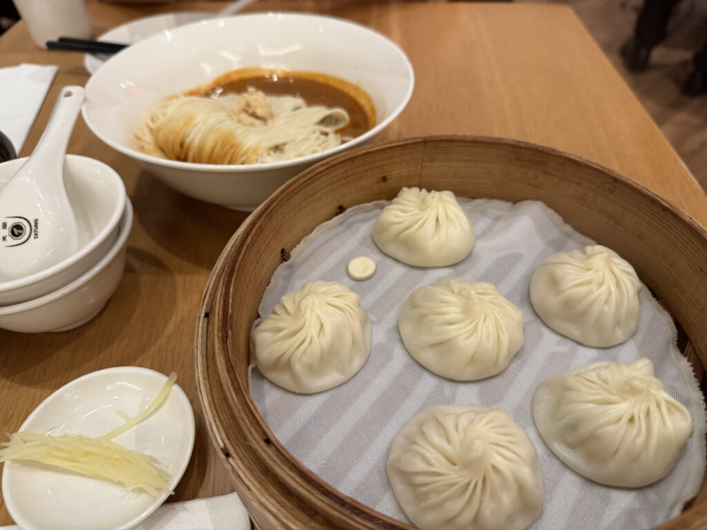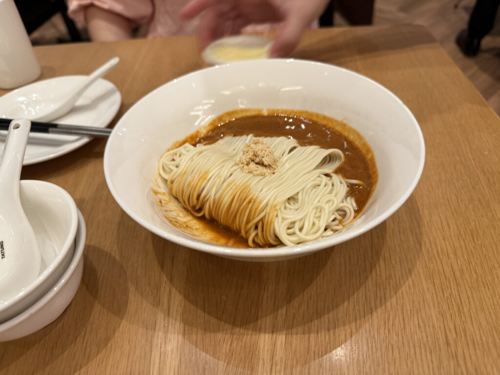 私たちは帆立の貝柱の小籠包を6つ、ジャージャー麺を一つ、シェアしたのですが、ジャージャー麺もちょっとだけチキンみたいなのがかかっていましたが基本的にピーナッツソースみたいな感じで私が考えるジャージャー麺とは少し違っていました。