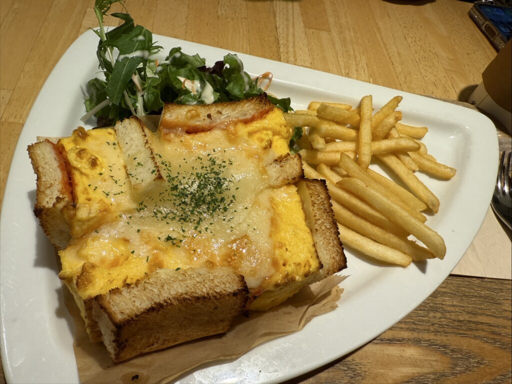 帰る途中のベシャメルカフェでお茶と、たまごチーズトーストを娘と半分こ。