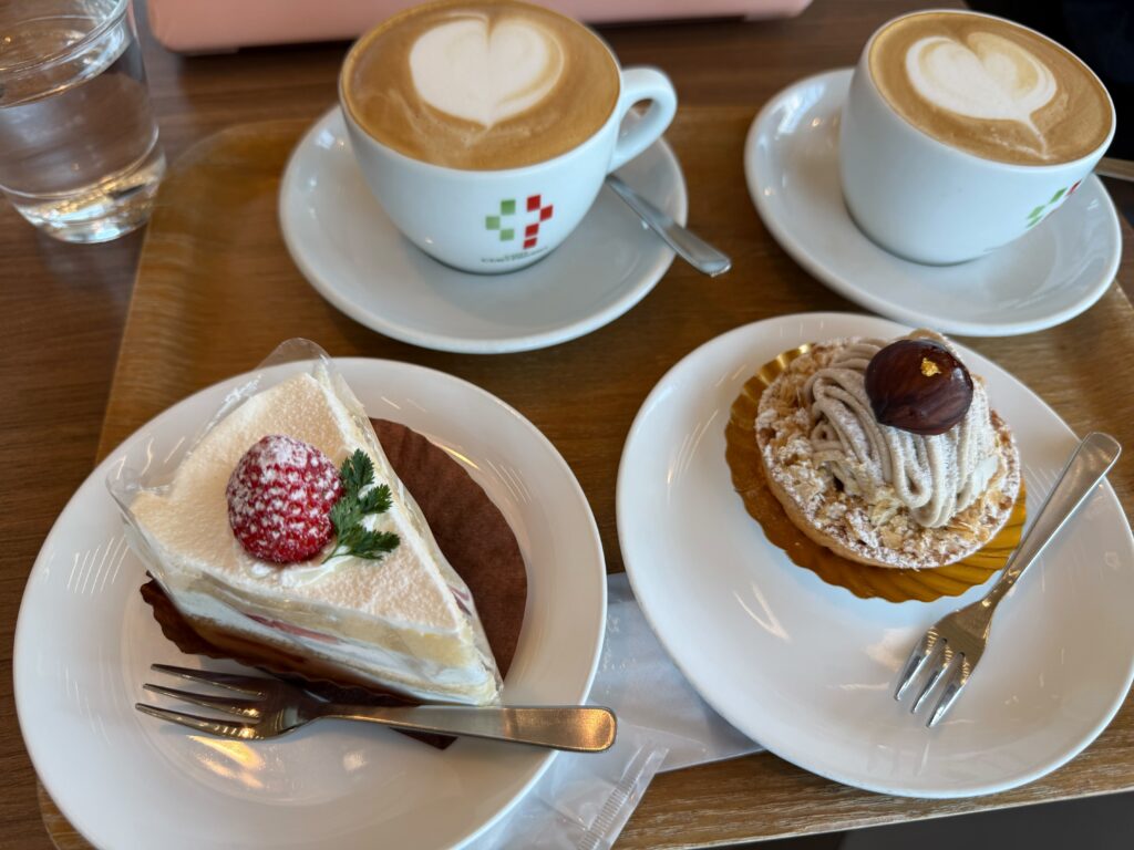 一通りやって疲れて、今度はカプチーノとケーキ。