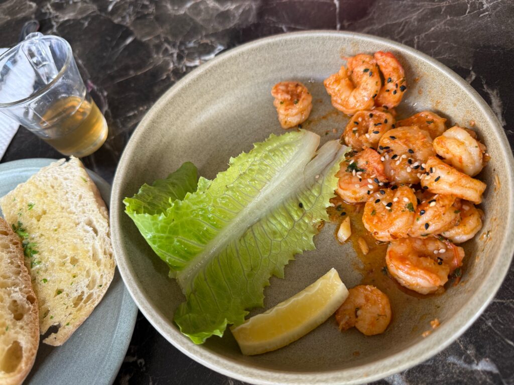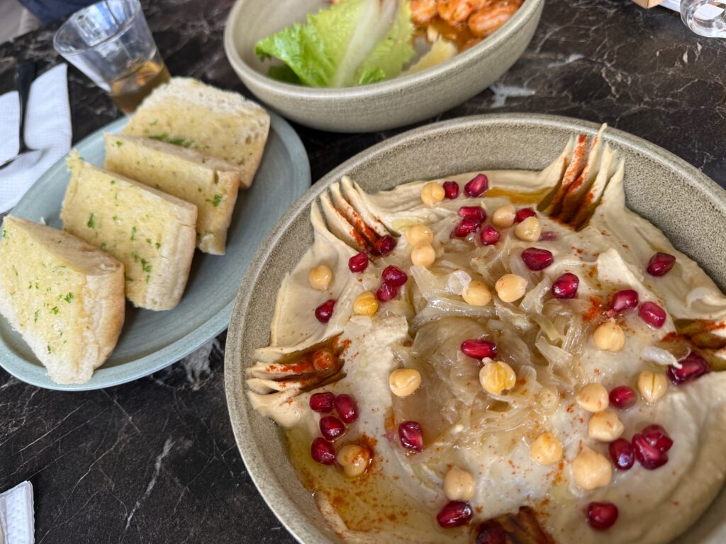 まあまあ重いものが多かったので、軽めにフムスとエビの炒め物。